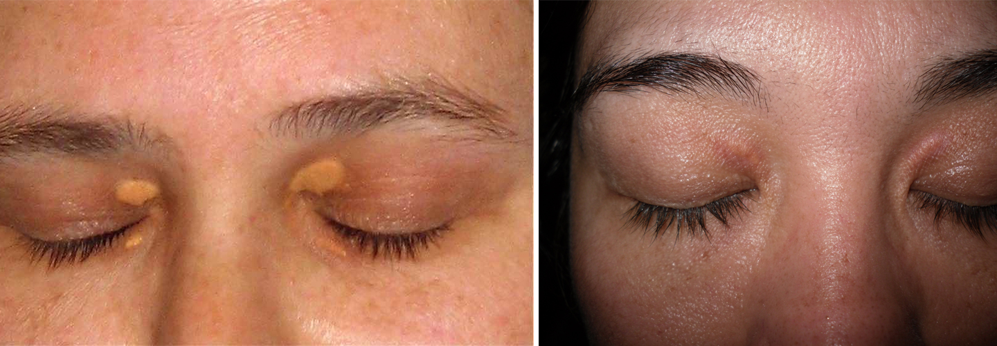 Approximately one half of patients with xanthelasma have high amounts of fats (lipids) in their blood, such as high cholesterol or high triglycerides. Xanthelasma is usually not itchy or tender. Individuals with xanthelasma are usually most concerned with their cosmetic appearance. If you have a lipid abnormality, exercise and dietary modifications will likely be recommended. Many people also require an oral medication to lower their lipids. Treatment of underlying lipid abnormalities does not cure every xanthelasma.